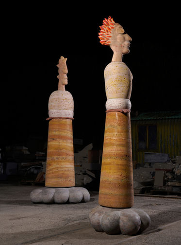 Featuring 6 kinds of Travertine Marble, coming from Iran, Hungary, Turkey and Italy. I add color to the holes which characterize Travertine. These sculptures kept changing and growing in my studio. I started with just the male head and Torso, but couldn't stop, adding Her, and continuing to the ground. Guardians, Gods, Personaggi.